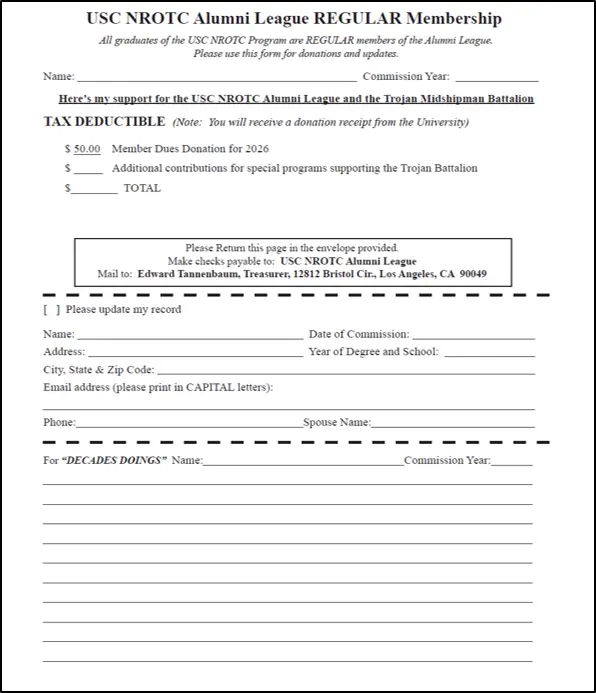 Click on the appropriate form below, print it, and mail it with a check payable to the USC NROTC Alumni League to: