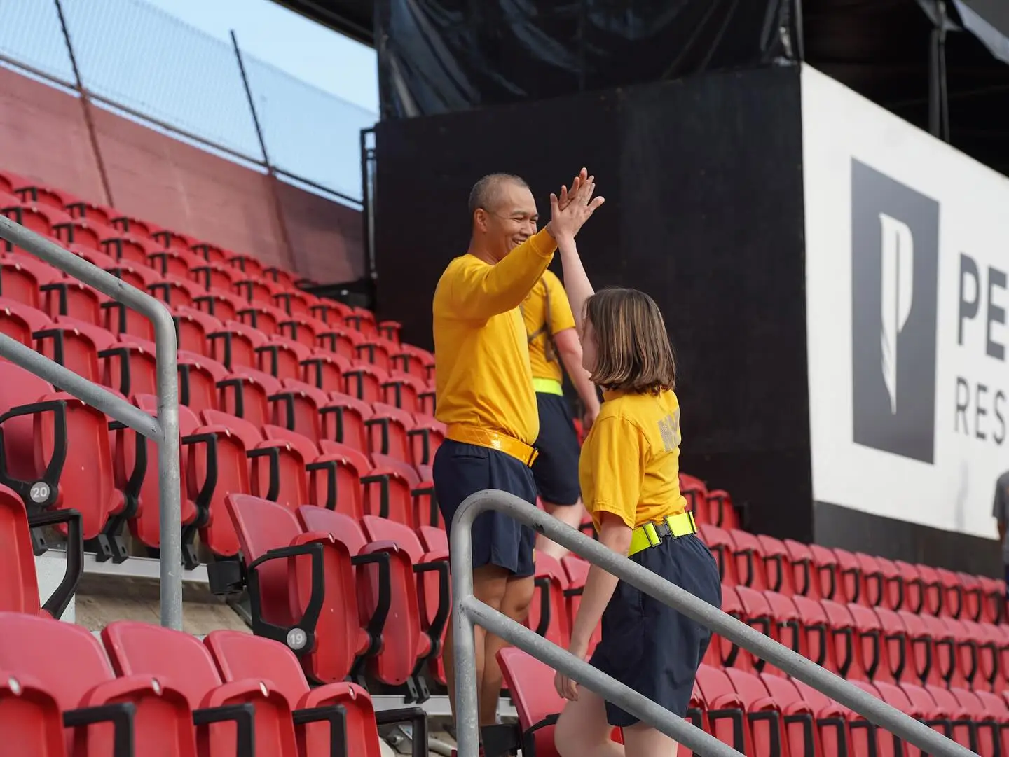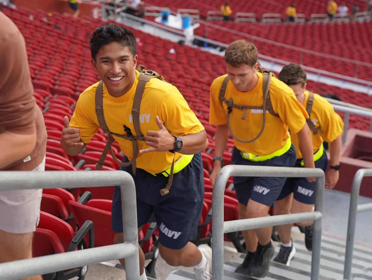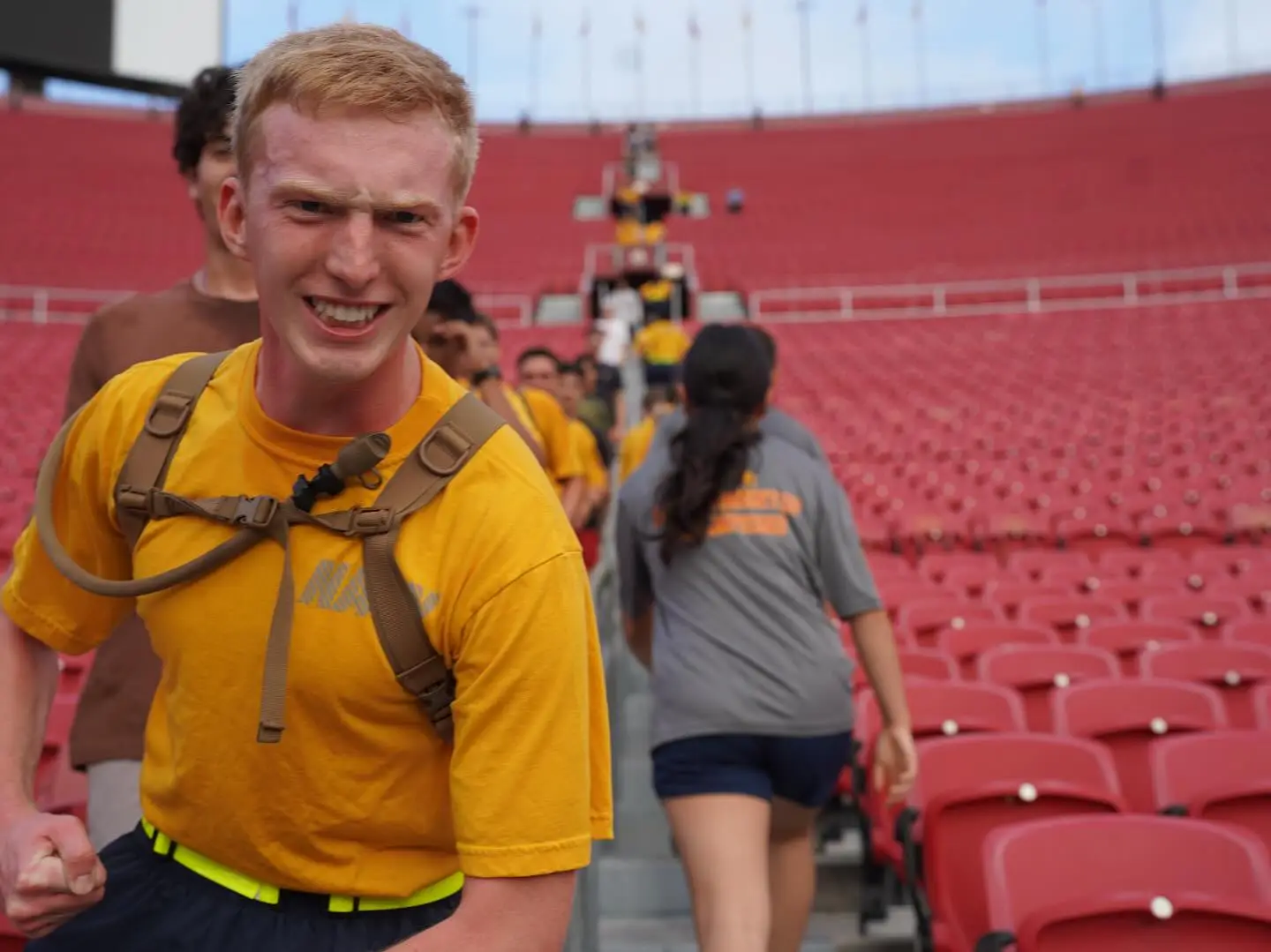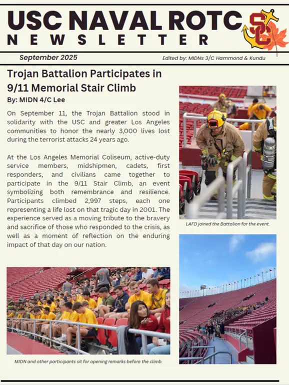 On 09/11/25 the Trojan Battalion came together with the other ROTC branches, USC students, and members of the Los Angeles community to climb 2,997 stairs to commemorate the lives lost on September 11, 2001. Hosted this year at the Los Angeles Memorial Coliseum, our midshipmen put in the work to climb the steep steps, honoring those who gave their lives to save so many others.