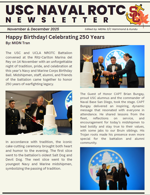 14 November: Midshipmen, active-duty staff, alumni, families, and guests from the USC Trojan Battalion and UCLA Bruin Battalion gathered at the Ritz-Carlton in Marina del Rey to celebrate the United States Navy and Marine Corps’ 250th birthdays at the annual Fall Ball. The evening was filled with tradition – from the presentation of colors to the ceremonial cutting of the cakes.