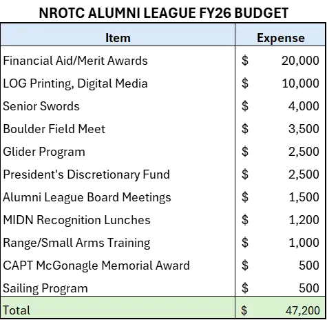 As of September 2025, our NROTC Alumni League Midshipman Success Endowment Fund at USC has a principal balance of just under $300,000. The annual interest from this endowment funds the $20,000 in scholarships/financial aid awarded each year by the Alumni League to deserving midshipmen as well as other Battalion activities approved by the Alumni League Board of Directors. The midshipmen of the Trojan Battalion truly appreciate your financial support of the Success Endowment Fund. Any questions regarding the Success Endowment Fund’s scholarship/financial aid program should be directed to Jerry Vieau at jerryvieau@yahoo.com.
